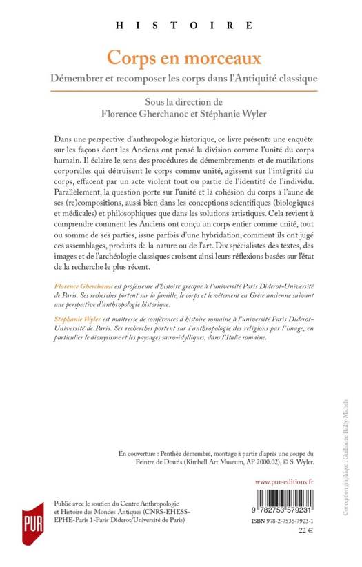 Dans une perspective d’anthropologie historique, ce livre présente une enquête sur les façons dont les Anciens ont pensé la division comme l’unité du corps humain. Il éclaire le sens des procédures de démembrements et de mutilations corporelles qui détruisent le corps comme unité, agissent sur l’intégrité du corps, effacent par un acte violent tout ou partie de l’identité de l’individu. Parallèlement, la question porte sur l’unité et la cohésion du corps à l’aune de ses (re)compositions, aussi bien dans les conceptions scientifiques (biologiques et médicales) et philosophiques que dans les solutions artistiques. Cela revient à comprendre comment les Anciens ont conçu un corps entier comme unité, tout ou somme de ses parties, issue parfois d’une hybridation, comment ils ont jugé ces assemblages, produits de la nature ou de l’art. Dix spécialistes des textes, des images et de l’archéologie classiques croisent ainsi leurs réflexions basées sur l’état de la recherche le plus récent.