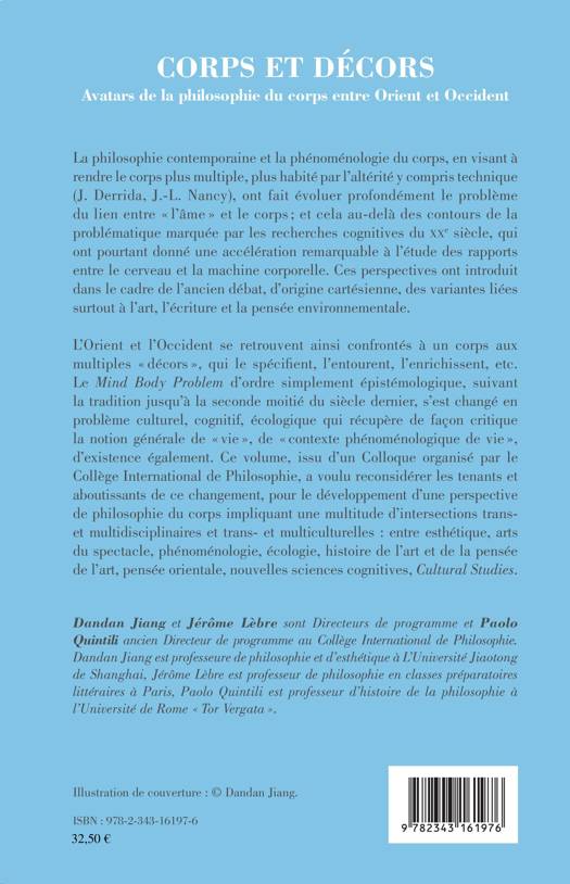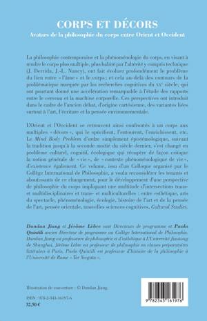 La philosophie contemporaine et la phénoménologie du corps, en visant à rendre le corps plus multiple, plus habité par l'altérité y compris technique (Derrida, J.-L. Nancy), ont fait évoluer profondément le problème du lien entre âme et corps. Ces perspectives ont introduit dans le débat d'origine cartésienne des variantes liées à l'art, l'écriture et l'environnement. Orient et Occident se retrouvent ainsi confrontés à un corps aux multiples « décors », qui le spécifient, l'entourent, l'enrichissent.