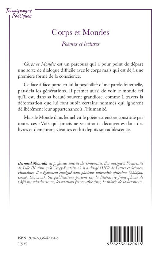 Corps et Mondes est un parcours qui a pour point de départ une sorte de dialogue difficile avec le corps mais qui est déjà une première forme de la conscience. Ce face à face porte en lui la possibilité d’une parole fraternelle, par-delà les générations. Il permet aussi de voir le monde tel qu’il est, dans sa beauté souvent grandiose, comme à travers la déformation que lui font subir certains hommes qui ignorent délibérément leur appartenance à l’Humanité. Mais le Monde dans lequel vit le poète est encore constitué par toutes ces « Voix qui jamais ne se tairont » découvertes dans des livres et demeurant vivantes en lui depuis son adolescence.