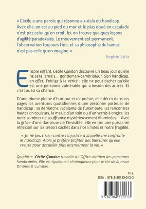 Encore enfant, Cécile Gandon découvre un beau jour qu’elle ne sera jamais… gentleman-cambrioleur. Son handicap, en effet, l’oblige à la vérité : elle ne peut cacher qu’elle est une personne vulnérable qui a besoin des autres. Et c’est aussi sa chance. D’une plume pleine d’humour et de poésie, elle décrit dans ces pages les aventures quotidiennes d’une personne porteuse de handicap : sa démarche vacillante de funambule, les rencontres hautes en couleurs, la magie d’un soin ou d’un vernis à ongles, les nuits sombres de souffrance mystérieusement illuminées… Avec la grâce d’une danseuse de l’invisible, elle en tire une puissante réflexion sur les trésors cachés dans nos limites et notre fragilité. « Je ne peux rien contre l’injustice à laquelle me confronte le handicap. Alors je préfère profiter des blessures qu’elle creuse pour accueillir plus intensément la vie. »