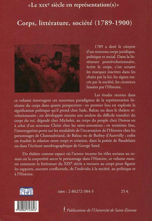 Avec la Révolution de 1789, l'individu devient plus que jamais marqué par le politique. A travers des oeuvres de Sade, Balzac, Dumas, Michelet et Baudelaire, les études s'interrogent sur la signification sociale du corps, montrant comment il permet de figurer les rapports (souvent conflictuels) de l'individu à la société, au politique et à l'Histoire.