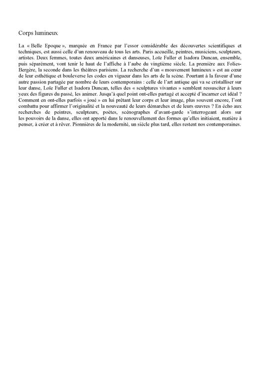 La « Belle Époque », marquée en France par l'essor considérable des découvertes scientifiques et techniques, est aussi celle d'un renouveau de tous les arts. Paris accueille peintres, musiciens, sculpteurs, artistes. Deux femmes, toutes deux américaines et danseuses, Loïe Fuller et Isadora Duncan, ensemble, puis séparément, vont tenir le haut de l'affiche à l'aube du vingtième siècle. La première aux Folies-Bergère, la seconde dans les théâtres parisiens. La recherche d'un « mouvement lumineux » est au cœur de leur esthétique et bouleverse les codes en vigueur dans les arts de la scène. Pourtant, à la faveur d'une autre passion partagée par nombre de leurs contemporains, celle de l'art antique qui va se cristalliser sur leur danse, Loïe Fuller et Isadora Duncan, telles des « sculptures vivantes » semblent ressusciter à leurs yeux des figures du passé, les animer. Jusqu'à quel point ont-elles partagé et accepté d'incarner cet idéal ? Comment en ont-elles parfois « joué » en lui prêtant leur corps et leur image, et plus souvent encore l'ont combattu pour affirmer l'originalité et la nouveauté de leurs démarches et de leurs œuvres ? En écho aux recherches de peintres, sculpteurs, poètes, scénographes d'avant-garde s'interrogeant alors sur les pouvoirs de la danse, elles ont apporté dans le renouvellement des formes qu'elles initiaient, matière à penser, à créer et à rêver. Pionnières de la modernité, un siècle plus tard, elles restent nos contemporaines.