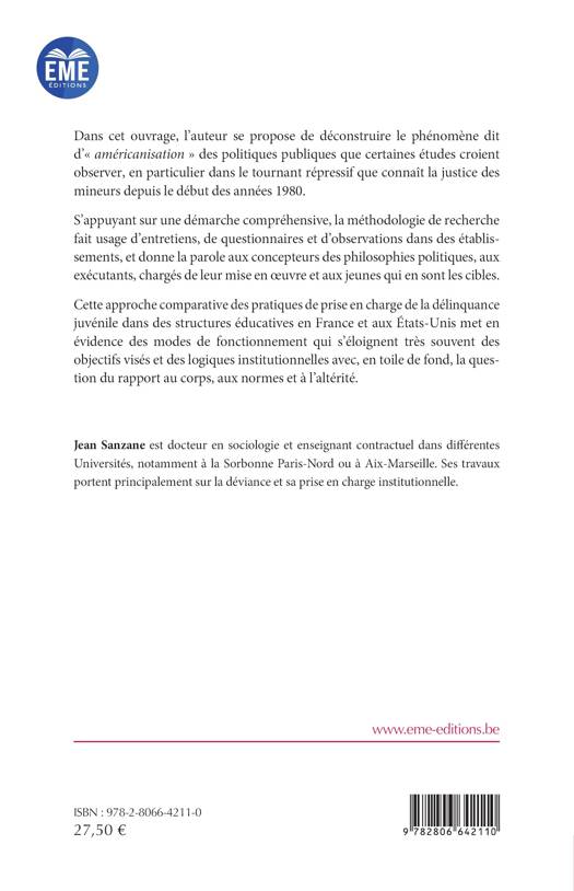Dans cet ouvrage, l'auteur se propose de déconstruire le phénomène dit d'"américanisation" des politiques publiques que certaines études croient observer, en particulier dans le tournant répressif que connaît la justice des mineurs depuis le début de années 1980. S'appuyant sur une démarche compréhensive, la méthodologie de recherche fait usage d'entretiens, de questionnaires et d'observations dans des établissements, et donne la parole aux concepteurs des philosophies politiques, aux exécutants, chargés de leur mise en oeuvre et aux jeunes qui en sont les cibles. Cette approche comparative des pratiques de prise en charge de la délinquance des jeunes dans des structures éducatives en France et aux États-Unis met en évidence des modes de fonctionnement qui s'éloignent très souvent des objectifs visés et des logiques institutionnelles avec, en toile de fond, la question du rapport au corps, aux normes et à l'altérité.