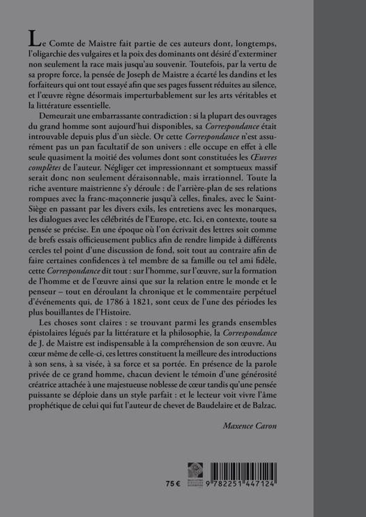 Le Comte de Maistre fait partie de ces auteurs dont, longtemps, l'oligarchie des vulgaires et la poix des dominants ont desire d'exterminer non seulement la race mais jusqu'au souvenir. Toutefois, par la vertu de sa propre force, la pensee de Joseph de Maistre a ecarte les dandins et les forfaiteurs qui ont tout essaye afin que ses pages fussent reduites au silence, et l'oeuvre regne desormais imperturbablement sur les arts veritables et la litterature essentielle. Demeurait une embarrassante contradiction: si la plupart des ouvrages du grand homme sont aujourd'hui disponibles, sa Correspondance etait introuvable depuis plus d'un siecle. Or cette Correspondance n'est assurement pas un pan facultatif de son univers: elle occupe en effet a elle seule quasiment la moitie des volumes dont sont constituees les OEuvres completes de l'auteur. Negliger cet impressionnant et somptueux massif serait donc non seulement deraisonnable, mais irrationnel. Toute la riche aventure maistrienne s'y deroule: de l'arriere-plan de ses relations rompues avec la franc-maconnerie jusqu'a celles, finales, avec le Saint- Siege en passant par les divers exils, les entretiens avec les monarques, les dialogues avec les celebrites de l'Europe, etc. Ici, en contexte, toute sa pensee se precise. En une epoque ou l'on ecrivait des lettres soit comme de brefs essais officieusement publics afin de rendre limpide a differents cercles tel point d'une discussion de fond, soit tout au contraire afin de faire certaines confidences a tel membre de sa famille ou tel ami fidele, cette Correspondance dit tout: sur l'homme, sur l'oeuvre, sur la formation de l'homme et de l'oeuvre ainsi que sur la relation entre le monde et le penseur - tout en deroulant la chronique et le commentaire perpetuel d'evenements qui, de 1786 a 1821, sont ceux de l'une des periodes les plus bouillantes de l'Histoire. Les choses sont claires: se trouvant parmi les grands ensembles epistolaires legues par la litterature et la philosophie, la Correspondance de J. de Maistre est indispensable a la comprehension de son oeuvre. Au coeur meme de celle-ci, ces lettres constituent la meilleure des introductions a son sens, a sa visee, a sa force et sa portee. En presence de la parole privee de ce grand homme, chacun devient le temoin d'une generosite creatrice attachee a une majestueuse noblesse de coeur tandis qu'une pensee puissante se deploie dans un style parfait: et le lecteur voit vivre l'ame prophetique de celui qui fut l'auteur de chevet de Baudelaire et de Balzac.