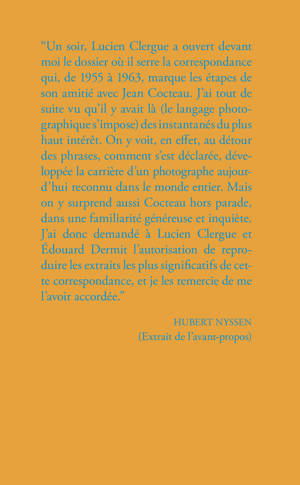 "Un soir, Lucien Clergue a ouvert devant moi le dossier où il serre la correspondance qui, de 1955 à 1963, marque les étapes de son amitié avec Jean Cocteau. J'ai tout de suite vu qu'il y avait là (le langage photographique s'impose) des instantanés du plus haut intérêt. On y voit, en effet, au détour des phrases, comment s'est déclarée, développée la carrière d'un photographe aujourd'hui reconnu dans le monde entier. Mais on y surprend aussi Cocteau hors parade, dans une familiarité généreuse et inquiète." Hubert Nyssen