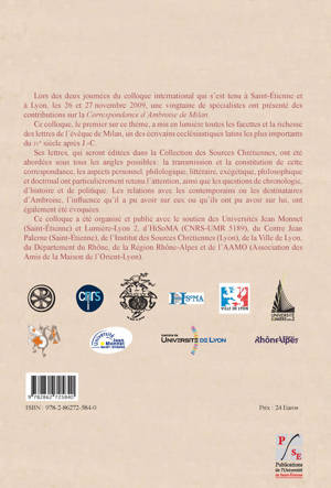 Lors des deux journées du colloque international qui s'est tenu à Saint-Étienne et à Lyon, les 26 et 27 novembre 2009, une vingtaine de spécialistes ont présenté des contributions sur la Correspondance d'Ambroise de Milan.