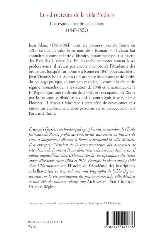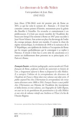 Jean Alaux fut nommé à Rome en 1847 pour succéder à Jean-Victor Schnetz. Son action sur place fut davantage de l’ordre du courage puisque, durant son mandat, il connut la chute du régime monarchique, la révolution de 1848 et la naissance de la IIe République, une épidémie de choléra et l’occupation de Rome par les troupes garibaldiennes, ce qui le contraignit à se replier à Florence. Il réussit à faire face à cette série de cataclysmes et à sauver un établissement dont personne ne se préoccupait, ni à Paris ni à Rome.