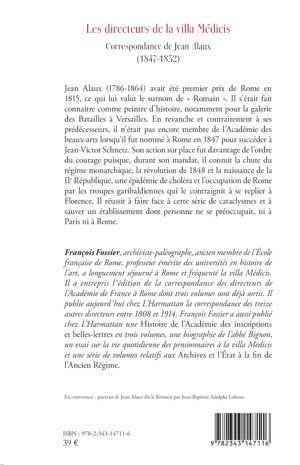 Jean Alaux fut nommé à Rome en 1847 pour succéder à Jean-Victor Schnetz. Son action sur place fut davantage de l'ordre du courage puisque, durant son mandat, il connut la chute du régime monarchique, la révolution de 1848 et la naissance de la IIe République, une épidémie de choléra et l'occupation de Rome par les troupes garibaldiennes, ce qui le contraignit à se replier à Florence. Il réussit à faire face à cette série de cataclysmes et à sauver un établissement dont personne ne se préoccupait, ni à Paris ni à Rome.