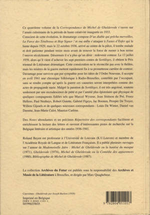 "Ce quatrième volume de la Correspondance de Michel de Ghelderode s'ouvre sur l'année culminante de la période de haute créativité inaugurée en 1933. Des Notes abondantes et un précieux Répertoire des correspondances facilitent et enrichissent la lecture des lettres et ouvrent d'intéressantes pistes de recherche sur la Belgique littéraire et artistique des années 1936-1941."