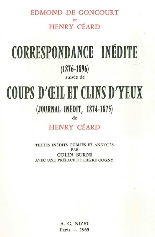 Une édition abondamment commentée de la Correspondance entre deux romanciers, dramaturges et critiques littéraires français, Edmond de Goncourt (1822-1896) et Henry Céard (1851-1924), suivie du Journal inédit de ce dernier, intitulé Coups d'œil et Clins d'yeux.