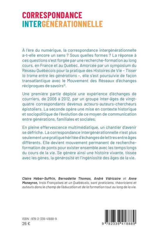 À l’ère du numérique, la correspondance intergénérationnelle a-t-elle encore un sens ? Sous quelles formes ? La réponse à ces questions s’est forgée par une recherche-formation au long cours, en France et au Québec. Amorcée par un symposium du Réseau Québécois pour la pratique des Histoires de Vie –Tisser la trame entre les générations–, elle s’est poursuivie de façon transatlantique avec le Mouvement des Réseaux d’échanges réciproques de savoirs®. Une première partie déploie une expérience d’échanges de courriers, de 2006 à 2012, par un groupe inter-âges de vingt-quatre correspondants devenus acteurs-auteurs-chercheurs épistoliers. La seconde opère une mise en contexte historique et sociopolitique de l’évolution de ce moyen de communication entre générations, familiales et sociales. En pleine effervescence multimédiatique, un chantier d’avenir se défriche. La correspondance intergénérationnelle n’est plus seulement une pratique héritée d’échanges de lettres entre âges différents. Elle devient mouvement permanent de recherche-formation de ponts pour exister ensemble avec les temps longs du cours de la vie. Se génère ainsi une histoire vivante, tissée avec les gènes, la générosité et l’ingéniosité des âges de la vie.