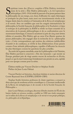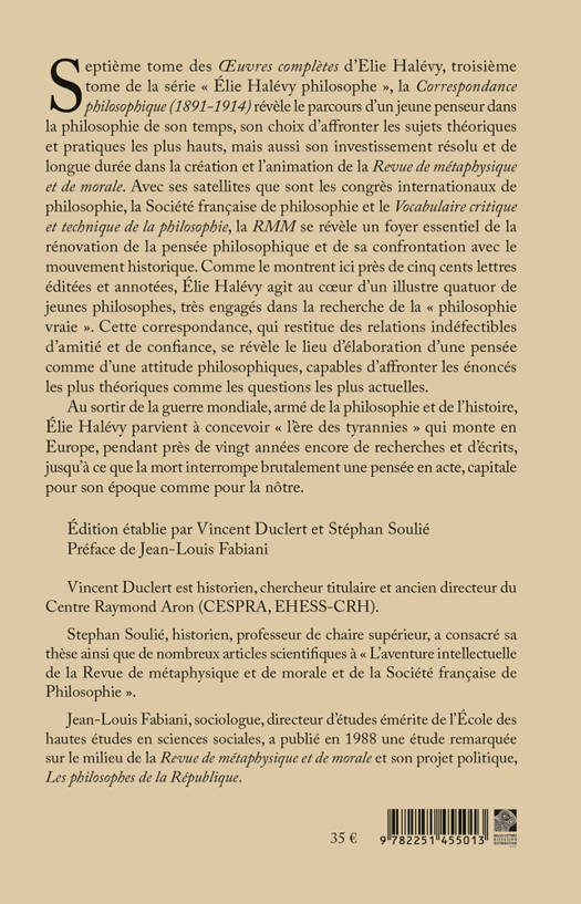Septième tome des OEuvres complètes d’Elie Halévy, troisième tome de la série « Élie Halévy philosophe », la Correspondance philosophique (1891-1914) révèle le parcours d’un jeune penseur dans la philosophie de son temps, son choix d’affronter les sujets théoriques et pratiques les plus hauts, mais aussi son investissement résolu et de longue durée dans la création et l’animation de la Revue de métaphysique et de morale. Avec ses satellites que sont les congrès internationaux de philosophie, la Société française de philosophie et le Vocabulaire critique et technique de la philosophie, la RMM se révèle un foyer essentiel de la rénovation de la pensée philosophique et de sa confrontation avec le mouvement historique. Comme le montrent ici près de cinq cents lettres éditées et annotées, Élie Halévy agit au coeur d’un illustre quatuor de jeunes philosophes, très engagés dans la recherche de la « philosophie vraie ». Cette correspondance, qui restitue des relations indéfectibles d’amitié et de confiance, se révèle le lieu d’élaboration d’une pensée comme d’une attitude philosophiques, capables d’affronter les énoncés les plus théoriques comme les questions les plus actuelles.