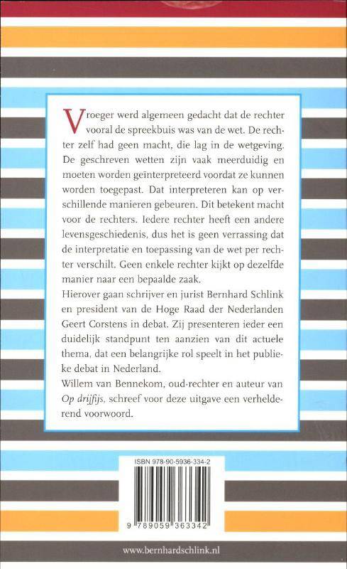 Vroeger werd algemeen gedacht dat de rechter vooral de spreekbuis was van de wet. De rechter zelf had geen macht, die lag in de wetgeving. Dat denken we nu niet meer. De geschreven wetgeving – neergelegd in wetten en in uitspraken van hogere rechtbanken die moeten worden overgenomen door lagere rechtbanken – is vaak meerduidig of vaag. De wet moet worden geïnterpreteerd voordat hij kan worden toegepast en dat interpreteren kan op verschillende manieren gebeuren. Dit betekent macht voor de rechters. Iedere rechter heeft een andere levensgeschiedenis en persoonlijkheid, dus is het geen verrassing dat de interpretatie en toepassing van de wet vaak per rechter verschilt. Geen enkele rechter kijkt op dezelfde manier naar een bepaalde zaak. Hierover debatteerden eind 2010 schrijver en jurist Bernhard Schlink en president van de Hoge Raad der Nederlanden Geert Corstens in het Haagse Vredespaleis. Bernhard Schlink was op dat moment te gast bij het NIAS (Netherlands Institute for Advanced Study) in Wassenaar en benoemd tot Vredesfilosoof in Den Haag. Schlink en Corstens presenteren ieder een duidelijk standpunt ten aanzien van dit actuele thema, dat een belangrijke rol speelt in het publieke debat in Nederland. In Objectieve wetgeving en subjectieve rechters zijn hun stellingen en hun weloverwogen reacties op elkaar opgenomen zowel in het Nederlands als in het Engels.
