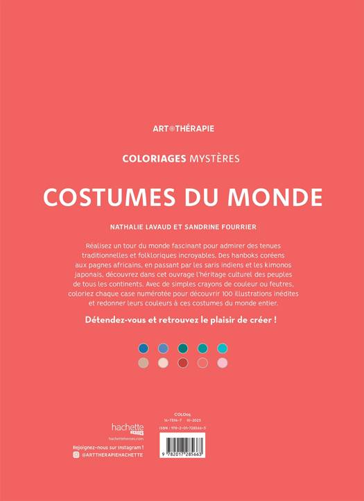 Réalisez un tour du monde fascinant pour admirer des tenues traditionnelles et folkloriques incroyables. Des hanboks coréens aux pagnes africains, en passant par les saris indiens et les kimonos japonais, découvrez dans cet ouvrage l’héritage culturel des peuples de tous les continents. Avec de simples crayons de couleur ou feutres, coloriez chaque case numérotée pour découvrir 100 illustrations inédites et redonner leurs couleurs à ces costumes du monde entier.
