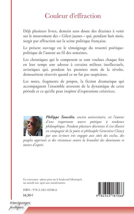 Déjà plusieurs livres, demain sans doute des dizaines à venir sur le mouvement des « Gilets jaunes » qui, pendant huit mois, surgit par effraction sur la scène politique française. Le présent ouvrage est le témoignage du ressenti poétique-politique de l'auteur au fil des semaines. Les chroniques qui le composent se sont voulues chaque fois en leur temps une adresse à certains milieux intellectuels, artistiques qui, pendant les premiers mois de la révolte, demeurèrent réservés quand ce ne fut pas suspicieux. Les notes, fragments de propos, la fiction dramatique qui accompagnent l'ensemble attestent de la dynamique de cette période et ce qu'elle peut inspirer d'expressions créatrices.