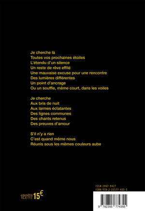 Ce livre regroupe deux recueils. Un sur ce que sont nos matins, de doute, d'espoir ou encore coincés dans le rêve. L'autre autour des couleurs. Des textes à picorer ou à suivre. Des morceaux de matins, une palette de couleurs. De la poésie qui explore des vies, des formes. Plus de questions que de réponses. Peut-être de quoi nous ressembler.