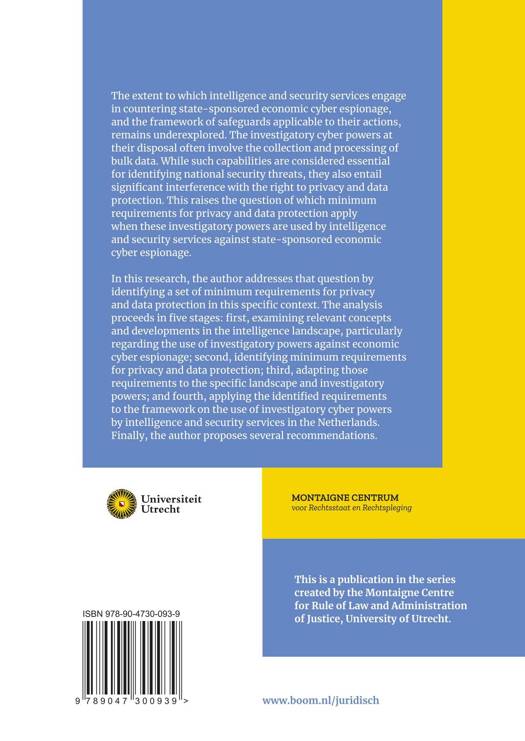 The extent to which intelligence and security services engage in countering state-sponsored economic cyber espionage, and the framework of safeguards applicable to their actions, remains underexplored. The investigatory cyber powers at their disposal often involve the collection and processing of bulk data. While such capabilities are considered essential for identifying national security threats, they also entail significant interference with the right to privacy and data protection. This raises the question of which minimum requirements for privacy and data protection apply when these investigatory powers are used by intelligence and security services against state-sponsored economic cyber espionage. In this research, the author addresses that question by identifying a set of minimum requirements for privacy and data protection in this specific context. The analysis proceeds in five stages: first, examining relevant concepts and developments in the intelligence landscape, particularly regarding the use of investigatory powers against economic cyber espionage; second, identifying minimum requirements for privacy and data protection; third, adapting those requirements to the specific landscape and investigatory powers; and fourth, applying the identified requirements to the framework on the use of investigatory cyber powers by intelligence and security services in the Netherlands. Finally, the author proposes several recommendations.