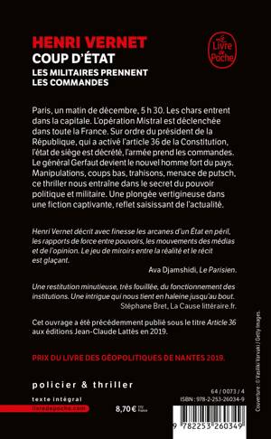Paris, un matin de décembre, 5 h 30. Les chars entrent dans la capitale. L’opération Mistral est déclenchée dans toute la France. Sur ordre du président de la République, qui a activé l’article 36 de la Constitution, l’état de siège est déclaré, l’armée prend les commandes. Le général Gerfaut devient le nouvel homme fort du pays.