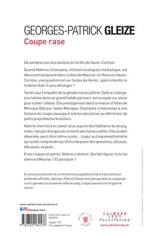 De sombres secrets hantent les forêts de Haute-Corrèze Quand Mathieu Champeix, militant écologiste médiatique, est découvert assassiné dans un bois de Mauriac-le-Vieux en Haute- Corrèze, une question est sur toutes les lèvres : quels intérêts ce trublion était-il venu déranger ? Tandis que l’enquête de la gendarmerie piétine, Valérie Lafarge, journaliste dans un grand hebdo parisien, est envoyée sur place pour traiter l’affaire. Elle prend pension dans la maison d’hôtes de Monique Belcour. Selon Monique, Champeix s’intéressait à une histoire de coupe sauvage d’arbres séculaires au détriment de petits propriétaires forestiers. Valérie cherche à en savoir plus auprès des habitants du bourg, mais c’est peu dire que sa curiosité est mal accueillie. Elle se sent observée, peut-être même suivie… Jusqu’au traquenard sinistre qui lui fait comprendre qu’à force de poser des questions, elle joue, elle aussi, sa peau… À ses risques et périls, Valérie s’obstine. Qui fait régner la loi du silence à Mauriac ? Et pourquoi ?