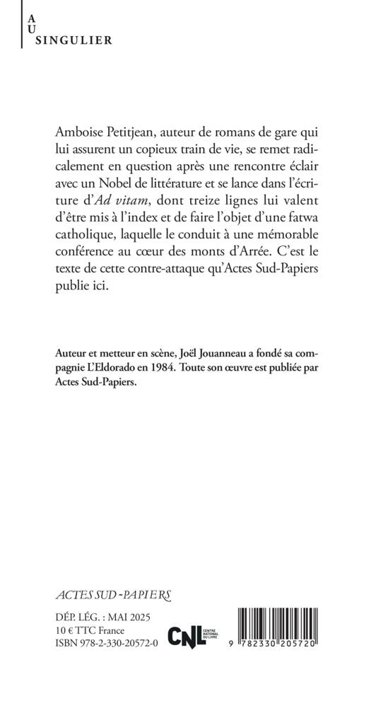 Amboise Petitjean, auteur de romans de gare qui lui assurent un copieux train de vie, se remet radicalement en question après une rencontre éclair avec un Nobel de littérature et se lance dans l'écriture d'Ad vitam, dont treize lignes lui valent d'être mis à l'index et de faire l'objet d'une fatwa catholique, laquelle le conduit à une mémorable conférence au coeur des monts d'Arrée. C'est le texte de cette contre-attaque qu'Actes Sud-Papiers publie ici.
