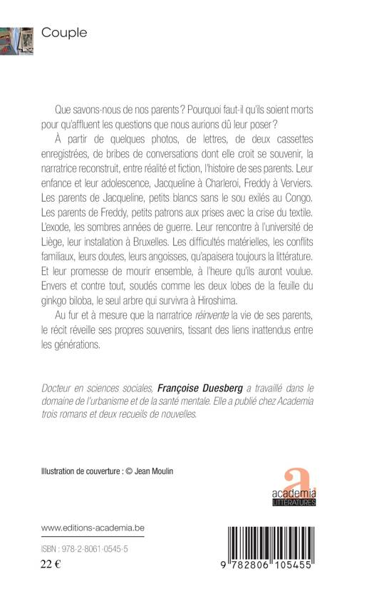 À partir de lettres, de photos, d'anciennes conversations, Françoise reconstruit, entre réalité et fiction, l'histoire de ses parents. Leur enfance et leur adolescence, Jacqueline à Charleroi, Freddy à Verviers. Ses parents à elle, petits blancs sans le sou exilés au Congo. Ses parents à lui, petits patrons aux prises avec la crise du textile. L'exode, les sombres années de guerre. Leur rencontre à l'université de Liège. Les balades à pied et à vélo, l'amour des livres. La naissance d'un couple.