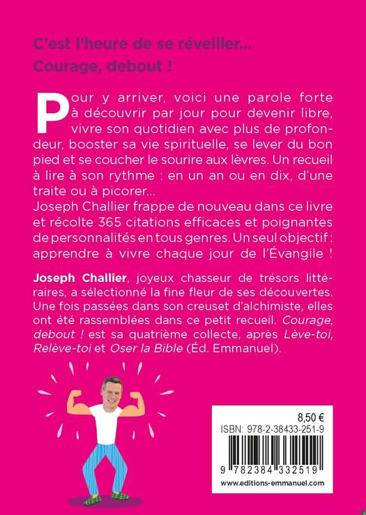 Joseph Challier Pour y arriver, voici une parole forte à découvrir par jour pour devenir libre, vivre son quotidien avec plus de profondeur, booster sa vie spirituelle, se lever du bon pied et se coucher le sourire aux lèvres. Un recueil à lire à son rythme : en un an ou en dix, d’une traite ou à picorer… Joseph Challier frappe de nouveau dans ce livre et récolte 365 citations efficaces et poignantes de personnalités en tous genres. Un seul objectif : apprendre à vivre chaque jour de l’Évangile !