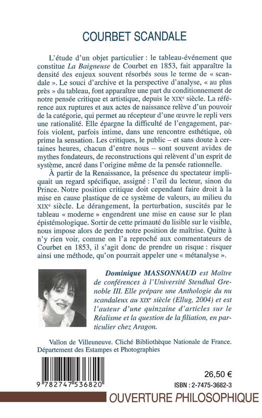 L'étude d'un objet particulier : le tableau-événement que constitue "La Baigneuse" de Courbet en 1853, fait apparaître la densité des enjeux souvent résorbés sous le terme de "scandale". Le souci d'archive et la perspective d'analyse "au plus près" du tableau, font apparaître une part du conditionnement de notre pensée critique et artisitique, depuis le XIXe siècle. Sortir de cette primauté du lisible sur le visible, nous impose alors de perdre notre position de maîtrise. Quitte à n'y rien voir, comme on l'a reproché aux commentateurs de Courbet en 1853, il s'agit donc de prendre un risque : risquer ainsi une méthode, qu'on pourrait appeler une "métanalyse".