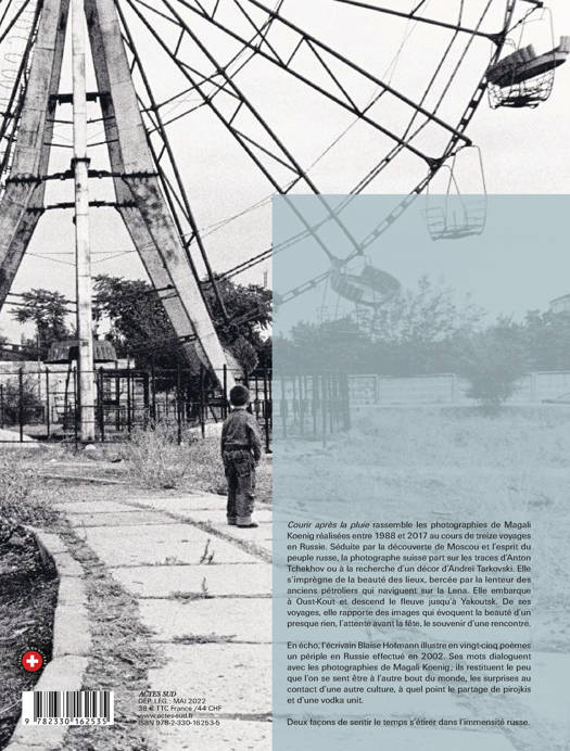 Courir après la pluie rassemble les photographies de Magali Koenig réalisées entre 1988 et 2017 au cours de treize voyages en Russie. Séduite par la découverte de Moscou et l'esprit du peuple russe, la photographe suisse part sur les traces d'Anton Tchekhov ou à la recherche d'un décor d'Andreï Tarkovski. Elle s'imprègne de la beauté des lieux, bercée par la lenteur des anciens pétroliers qui naviguent sur la Lena. Elle embarque à Oust-Kout et descend le fleuve jusqu'à Yakoutsk. De ses voyages, elle rapporte des images qui évoquent la beauté d'un presque rien, l'attente avant la fête, le souvenir d'une rencontre.