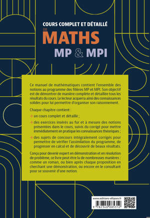 Ce manuel de mathématiques contient l’ensemble des notions au programme des filières MP et MPI. Son objectif est de démontrer de manière complète et détaillée pratiquement tous les résultats du cours. Le lecteur acquerra ainsi des connaissances solides pour lui permettre d’organiser son raisonnement.