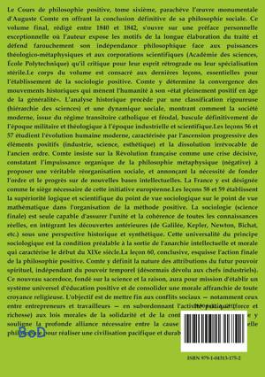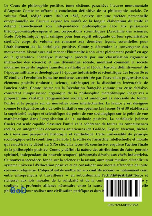 Le Cours de philosophie positive, tome sixième, parachève l'oeuvre monumentale d'Auguste Comte en offrant la conclusion définitive de sa philosophie sociale. Ce volume final, rédigé entre 1840 et 1842, s'ouvre sur une préface personnelle exceptionnelle où l'auteur expose les motifs de la longue élaboration du traité et défend farouchement son indépendance philosophique face aux puissances théologico-métaphysiques et aux corporations scientifiques (Académie des sciences, École Polytechnique) qu'il critique pour leur esprit rétrograde ou leur spécialisation stérile.Le corps du volume est consacré aux dernières leçons, essentielles pour l'établissement de la sociologie positive. Comte y détermine la convergence des mouvements historiques qui mènent l'humanité à son «état pleinement positif en âge de la généralité». L'analyse historique procède par une classification rigoureuse (hiérarchie des sciences) et une dynamique sociale, montrant comment la société moderne, issue du régime transitoire catholique et féodal, bascule définitivement de l'époque militaire et théologique à l'époque industrielle et scientifique.Les leçons 56 et 57 étudient l'évolution humaine moderne, caractérisée par l'ascension progressive des éléments positifs (industrie, science, esthétique) et la dissolution irrévocable de l'ancien ordre. Comte insiste sur la Révolution française comme une crise décisive, constatant l'impuissance organique de la philosophie métaphysique (négative) à proposer une véritable réorganisation sociale, et annonçant la nécessité de fonder l'ordre et le progrès sur de nouvelles bases intellectuelles. La France y est désignée comme le siège nécessaire de cette initiative européenne.Les leçons 58 et 59 établissent la supériorité logique et scientifique du point de vue sociologique sur le point de vue mathématique dans l'organisation de la méthode positive. La sociologie (science finale) est seule capable d'assurer l'unité et la cohérence de toutes les connaissances réelles, en intégrant les découvertes antérieures (de Galilée, Kepler, Newton, Bichat, etc.) sous une perspective historique et synthétique. Cette universalité du principe sociologique est la condition préalable à la sortie de l'anarchie intellectuelle et morale qui caractérise le début du XIXe siècle.La leçon 60, conclusive, esquisse l'action finale de la philosophie positive. Comte y définit la nature des attributions du futur pouvoir spirituel, indépendant du pouvoir temporel (désormais dévolu aux chefs industriels). Ce nouveau sacerdoce, fondé sur la science et la raison, aura pour mission d'établir un système universel d'éducation positive et de consolider une morale affranchie de toute croyance religieuse. L'objectif est de mettre fin aux conflits sociaux — notamment ceux entre entrepreneurs et travailleurs — en subordonnant l'activité pratique (force et richesse) aux lois morales de la solidarité et de la continuité humaine. Comte y souligne la profonde alliance nécessaire entre la cause populaire et la nouvelle philosophie pour réaliser une civilisation pacifique et durable.