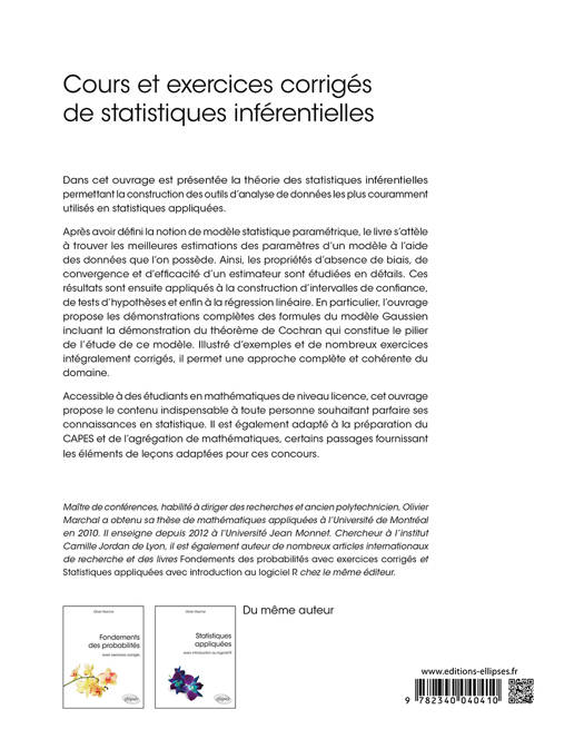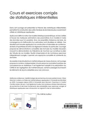 Illustré d’exemples et de nombreux exercices intégralement corrigés, il permet une approche complète et cohérente des statistiques inférentielles. Il est principalement destiné aux étudiants de licence de mathématiques, aux étudiants d’écoles d’ingénieur ou préparant les concours du CAPES ou de l’agrégation de mathématiques souhaitant acquérir de bonnes compétences en statistique.