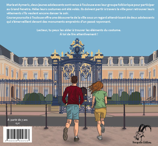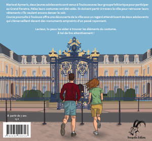 Marie et Aymeric, deux jeunes adolescents sont venus à Toulouse avec leur groupe folklorique pour participer au Grand Fenetra. Hélas leurs costumes ont été volés. Ils doivent partir à travers la ville pour retrouver leurs vêtements s’ils veulent encore danser le soir. Course poursuite à Toulouse offre une découverte de la ville sous un regard attendrissant de deux adolescents qui s’émerveillent devant des monuments empreints d’un passé rayonnant. Lecteur, tu peux les aider à trouver les éléments du costume. Á toi de lire attentivement !