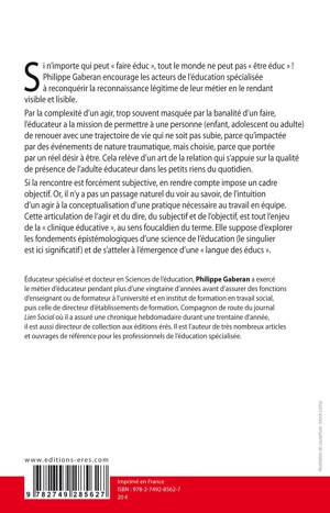 Si n’importe qui peut « faire éduc » tout le monde ne peut pas « être éduc » ! Philippe Gaberan dans cet ouvrage, encourage les acteurs de l’éducation spécialisée à reconquérir la reconnaissance légitime de leur métier en le rendant visible et lisible. L’éducation spécialisée est un « art » de l’accompagnement aux tout petits riens du quotidien, soutenu par une science de l’éducation.