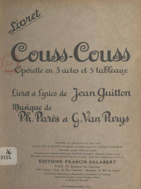 Opérette en 3 actes et 5 tableaux. Livret et lyrics de Jean Guitton, musique de Philippe Parès et Georges Van Parys