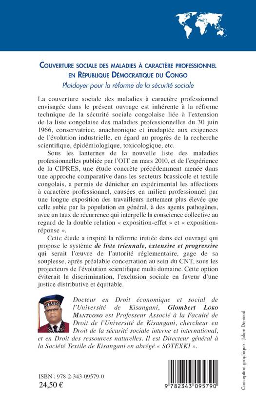 La couverture sociale des maladies à caractère professionnel envisagée dans cet ouvrage est inhérente à la réforme technique de la sécurité sociale congolaise datant du 30 juin 1966, conservatrice, anachronique et inadaptée. Cet ouvrage envisage des solutions perfectibles sous-tendant des recommandations qui, une fois appliquées par le Gouvernement de la République Démocratique du Congo, permettrait à la fois, d'assurer la prévention par la réorganisation de la médecine du travail et d'améliorer le sort des victimes des maladies à caractère professionnel.