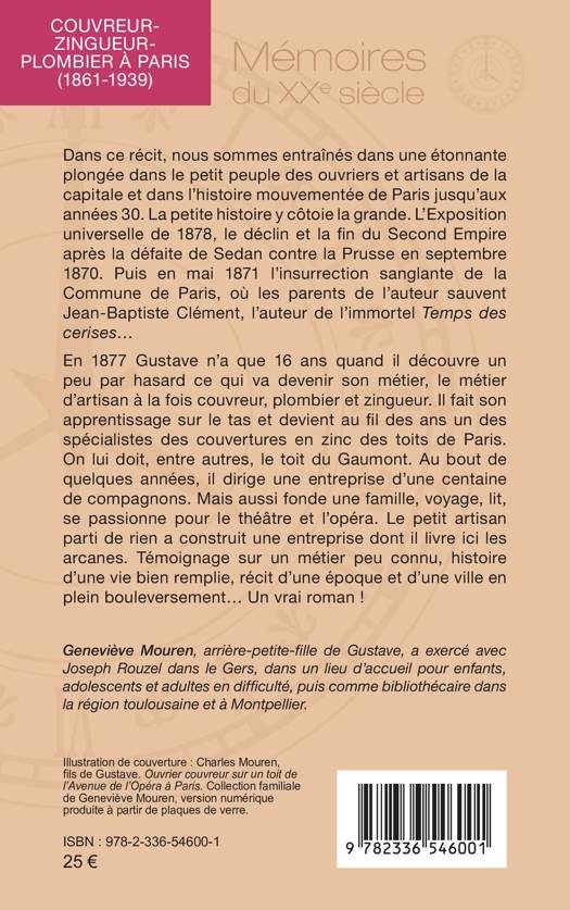 Dans ce récit, nous sommes entraînés dans une étonnante plongée dans le petit peuple des ouvriers et artisans de la capitale et dans l'histoire mouvementée de Paris jusqu'aux années 30. La petite histoire y côtoie la grande. L'Exposition universelle de 1878, le déclin et la fin du Second Empire après la défaite de Sedan contre la Prusse en septembre 1870. Puis en mai 1871 l'insurrection sanglante de la Commune de Paris, où les parents de l'auteur sauvent Jean-Baptiste Clément, l'auteur de l'immortel Temps des cerises... En 1877 Gustave n'a que 16 ans quand il découvre un peu par hasard ce qui va devenir son métier, le métier d'artisan à la fois couvreur, plombier et zingueur. Il fait son apprentissage sur le tas et devient au fil des ans un des spécialistes des couvertures en zinc des toits de Paris. On lui doit, entre autres, le toit du Gaumont. Au bout de quelques années, il dirige une entreprise d'une centaine de compagnons. Mais aussi fonde une famille, voyage, lit, se passionne pour le théâtre et l'opéra. Le petit artisan parti de rien a construit une entreprise dont il livre ici les arcanes. Témoignage sur un métier peu connu, histoire d'une vie bien remplie, récit d'une époque et d'une ville en plein bouleversement... Un vrai roman !