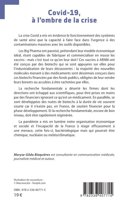 La crise Covid a mis en évidence le fonctionnement des systèmes de santé ainsi que la capacité à faire face dans l'urgence à des contaminations massives avec les outils disponibles. Les Big Pharma ont pavoisé, prétendant leur modèle économique idéal, étant capables de fabriquer et commercialiser en masse les vaccins mais c'est tout ce qu'on leur doit ! Ces vaccins à ARNM ont été conçus par des biotechs qui se sont appuyées sur elles pour l'industrialisation de leurs découvertes la majorité des nouvelles molécules menant à des médicaments sont désormais conçues dans ces biotechs financées par des fonds publics, obligées de leur vendre leurs brevets ou acculées à être rachetées par elles. La recherche fondamentale a déserté les firmes dont les directions ont échappé aux scientifiques, pour être prises en mains par des financiers ignorant ce qu'est un médicament. En parallèle, se sont développées des nuées de biotechs à la durée de vie souvent courte car il n'existe pas, en France, de soutien financier pour la phase développement. Et la recherche fondamentale, encore de bon niveau, doit être rapidement régénérée. La pandémie a mis en lumière notre organisation économique et sociale et l'incapacité de la France à réagir efficacement à une menace, cette fois-ci, bactériologique mais qui pourrait être chimique, nucléaire ou météo/climatique.