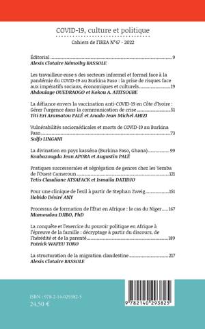 Éditorial..................................................................................................9 Alexis Clotaire Némoiby BASSOLE Les travailleur-euse-s des secteurs informel et formel face à la pandémie du COVID-19 au Burkina Faso: la prise de risques face aux impératifs sociaux, économiques et culturels..........................19 Abdoulaye OUEDRAOGO et Kokou A. ATITSOGBE La défiance envers la vaccination anti-COVID-19 en Côte d'Ivoire: Gérer l'urgence dans la communication de crise............................51 Titi Eri Aramatou PALÉ et Anado Jean Michel AHIZI Vulnérabilités sociomédicales et morts de COVID-19 au Burkina Faso.........................................................................................................73 Salfo LINGANI La divination en pays kasséna (Burkina Faso, Ghana).................. 99 Koubazougda Jean APORA et Augustin PALE Pratiques successorales et ségrégation de genres chez les Yemba de l'Ouest Cameroun...........................................................................121 Tetis Claudiane ATSAFACK et Ismaïla DATIDJO Pour une clinique de l'exil à partir de Stephan Zweig....................151 Hobido Désiré ANY Processus de formation de l'État en Afrique: le cas du Niger...... 167 Mamoudou DJIBO, PhD La conquête et l'exercice du pouvoir politique en Afrique à l'épreuve de la famille: décryptage à partir du discours, de l'hérédité et de la parenté..................................................................189 Patrick WAFEU TOKO La structuration de la migration clandestine................................ 217 Alexis Clotaire BASSOLE