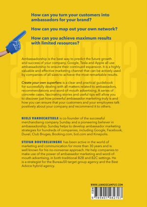 Create your own superfans is a clear and practical guidebook for successfully dealing with all matters related to ambassadors, recommendations and word-of-mouth advertising. A series of concrete cases, fascinating stories and useful tips will allow you to discover just how powerful ambassador marketing truly is and how you can ensure that your customers and your employees talk positively about your company and recommend it to others.