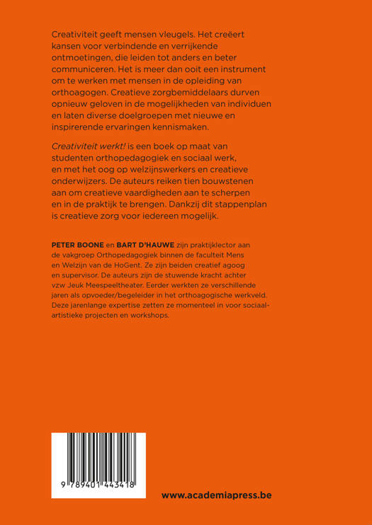 Creativiteit geeft mensen vleugels. Het creëert kansen voor verbindende en verrijkende ontmoetingen, die leiden tot anders en beter communiceren. Het is meer dan ooit een instrument om te werken met mensen in de opleiding van orthoagogen. Creatieve zorgbemiddelaars durven opnieuw geloven in de mogelijkheden van individuen en laten diverse doelgroepen met nieuwe en inspirerende ervaringen kennismaken. Creativiteit werkt! is een boek op maat van studenten orthopedagogiek en sociaal werk, en met het oog op welzijnswerkers en creatieve onderwijzers. De auteurs reiken tien bouwstenen aan om creatieve vaardigheden aan te scherpen en in de praktijk te brengen. Dankzij dit stappenplan is creatieve zorg voor iedereen mogelijk.