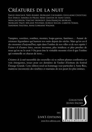 Créatures de la nuit rassemble des nouvelles où se mêlent plumes confirmées et voix émergentes, issues pour ces dernières de l’atelier d’écriture du festival Étrange Grande. Cette édition rend un hommage tout particulier à Anne Rice, maîtresse incontestée des ténèbres et marraine de nos peurs les plus intimes.
