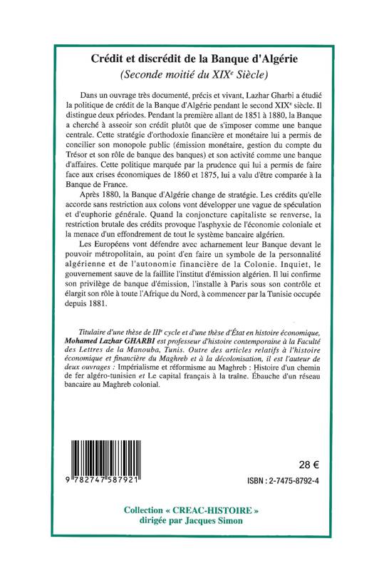 Dans un ouvrage très documenté, Lazhar Gharbi a étudié la politique de crédit de la Banque d'Algérie pendant le second XIXe siècle. Il distingue deux période. De 1851 à 1880, la Banque a cherché à asseoir son crédit plutôt que de s'imposer comme une banque centrale. Après 1880, elle change de stratégie, et les crédits qu'elle accorde sans restriction aux colons aboutissent à l'asphyxie de l'économie coloniale et à la menace d'un effondrement de tout le système bancaire algérien. Les Européens vont alors défendre avec acharnement leur Banque devant le pouvoir métropolitain, au point d'en faire un symbole de la personnalité algérienne et de l'autonomie financière de la Colonie.