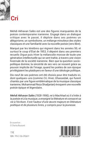 Mehdi Akhavan Salès est une des figures marquantes de la poésie contemporaine iranienne. Engagé dans un dialogue critique avec le passé, il déploie dans ses poèmes un allégorisme, un symbolisme, un mélange minutieux des styles classiques et une familiarité avec la nouvelle poésie (vers libre). Marqué par les ténèbres qui règnent dans les années 50, et surtout le coup d'État de 1953, il dépeint dans ses premiers recueils Orgue puis Hiver la mélancolie morose de toute une génération intellectuelle qui se sent trahie, à travers une vision hivernale de la société iranienne. Bien que la question socio-politique domine, la sincérité de ses vers se ressent grâce au pouvoir implicite de l'image, quand les poètes de son époque privilégiaient les plaidoyers en faveur d'une idéologie politique. Dix-neuf de ses poèmes ont été choisis pour être traduits ici, dont quelques-uns (comme Cri, Hiver, Ghassedak, qui furent chantés par une figure emblématique de la musique classique iranienne, Mohammad Reza Shadjarian) évoquent une nouvelle poésie épique et légendaire.
