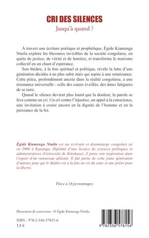 À travers une écriture poétique et prophétique, Égide Kiamenga Ntuila explore les blessures invisibles de la société congolaise, en quête de justice, de vérité et de lumière, et transforme le mutisme collectif en un chant d'espérance. Son théâtre, à la fois spirituel et politique, révèle la lutte d'une génération décidée à ne plus subir mais qui aspire à une renaissance. Cette pièce, profondément ancrée dans la réalité congolaise, a une résonance universelle: celle des coeurs éveillés, des âmes fatiguées de se taire. Quand le silence devient plus lourd que la douleur, la parole se lève comme un cri. Un cri contre l'injustice, un appel à la conscience, une invitation à croire encore en la dignité de l'homme et en la puissance de la foi.