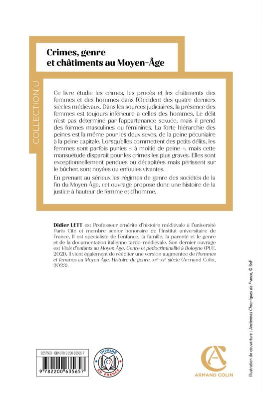 Ce livre étudie les crimes, les procès et les châtiments des femmes et des hommes dans l'Occident des quatre derniers siècles médiévaux. Dans les sources judiciaires, la présence des femmes est toujours inférieure à celles des hommes. Le délit n'est pas déterminé par l'appartenance sexuée, mais il prend des formes masculines ou féminines. La forte hiérarchie des peines est la même pour les deux sexes, de la peine pécuniaire à la peine capitale. Lorsqu'elles commettent des petits délits, les femmes sont parfois punies « à moitié de peine », mais cette mansuétude disparaît pour les crimes les plus graves. Elles sont exceptionnellement pendues ou décapitées mais périssent sur le bûcher, sont noyées ou enfouies vivantes.