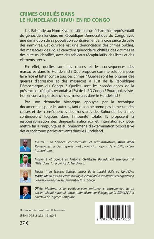 Les Bahunde au Nord-Kivu constituent un échantillon représentatif du génocide silencieux en République Démocratique du Congo avec une diminution de sa population contrairement à la croissance de celle des immigrés. Cet ouvrage est une dénonciation des crimes oubliés, des massacres, des viols à caractère génocidaire, chiffrés, des victimes et des auteurs identifiés, avec des tableaux récapitulatifs, des listes et des éléments précis. En effet, quelles sont les causes et les conséquences des massacres dans le Hundeland ? Que proposer comme solutions pour faire face et lutter contre toutes ces crimes ? Quelles sont les origines des guerres d'agression et des massacres à l'Est de la République Démocratique du Congo ? Quelles sont les conséquences de la présence de réfugiés rwandais à l'Est de la RD Congo ? Pourquoi assiste-t-on encore à la persistance des massacres dans le Hundeland ? Par une démarche historique, appuyée par la technique documentaire, pour les auteurs, tant qu'on ne prend pas la mesure des causes et des conséquences des massacres des Buhunde, les crimes continueront toujours dans l'impunité totale. Ils proposent la responsabilisation des dirigeants nationaux et internationaux pour mettre fin à l'impunité et au phénomène d'extermination progressive des autochtones par les arrivants dans le Hundeland.
