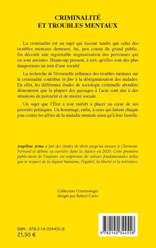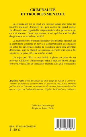 La criminalité est un sujet qui fascine tandis que celui des troubles mentaux demeure, lui, peu connu du grand public. En découle une regrettable stigmatisation des personnes qui en sont atteintes. Beaucoup pensent, à tort, qu'elles sont des plus dangereuses au sein d'une société. La recherche de l'éventuelle influence des troubles mentaux sur la criminalité contribue in fine à la déstigmatisation des malades. En effet, les différentes études de sociologie criminelle abordées démontrent que la plupart des passages à l'acte sont dus à des situations de précarité et de misère sociale. Un sujet que l'État a tout intérêt à placer au coeur de ses priorités politiques. Un hommage, enfin, à ceux qui luttent chaque jour contre les affres de la maladie mentale ainsi qu'à leur famille.