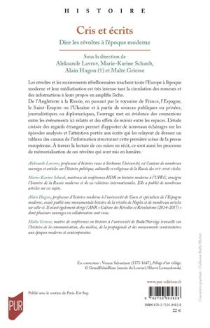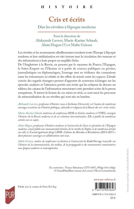 De l’Angleterre à la Russie, en passant par le royaume de France, l’Espagne, le Saint-Empire ou l’Ukraine et à partir de sources publiques ou privées, journalistiques ou diplomatiques, l’ouvrage met en évidence des connexions entre les événements ici relatés et des effets de miroir entre les espaces. L’étude croisée des regards étrangers permet d’apporter de nouveaux éclairages sur les épisodes analysés et l’attention portée aux écrits qui les relayent de dresser un tableau des canaux de l’information structurant cette première scène de la presse européenne. À travers la lecture de ces mises en récit, ce sont aussi les processus de mémorialisation de ces révoltes qui sont mis en lumière.