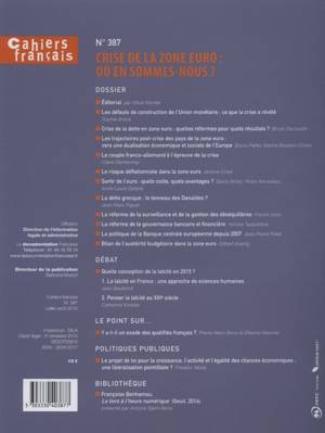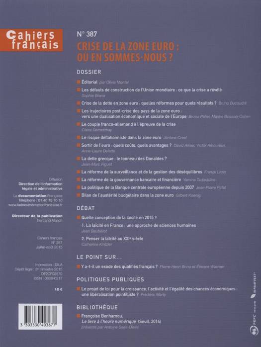 Ce dossier aborde les aspects institutionnels, politiques et économiques de l'Union monétaire et de sa crise : les failles structurelles de la communauté, l'impact des réformes, la dette grecque, le risque de déflation, le bilan des politiques d'austérité ou encore les relations franco-allemandes et les enjeux d'une sortie de la zone euro.