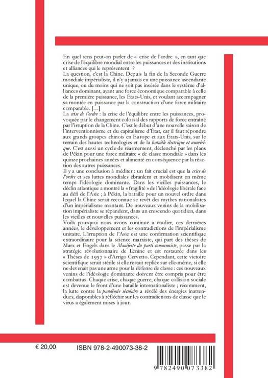 En quel sens peut-on parler de « crise de l’ordre », en tant que crise de l’équilibre mondial entre les puissances et des institutions et alliances qui le représentent ? La question, c’est la Chine. Depuis la fin de la Seconde Guerre mondiale impérialiste, il n’y a jamais eu une puissance ascendante unique, ou du moins qui ne soit pas insérée dans le système d’alliances dominant, ayant une force économique comparable à celle de la première puissance, les États-Unis, et voulant accompagner sa montée en puissance par la construction d’une force militaire comparable. […] La crise de l’ordre : la crise de l’équilibre entre les puissances, provoquée par le changement colossal des rapports de force entraîné par l’irruption de la Chine. C’est le début d’une nouvelle saison de l’interventionnisme et du capitalisme d’État, car il faut répondre aux grands groupes chinois en Europe et aux États-Unis, sur le terrain des hautes technologies et de la bataille électrique et numérique. C’est aussi un cycle de réarmement, déclenché par les plans de Pékin pour une force militaire « de classe mondiale » dans les quinze prochaines années et alimenté en conséquence par la réaction des autres puissances. Il y a une conclusion à méditer : un fait crucial est que la crise de l’ordre et ses luttes mondiales ébranlent et mobilisent en même temps l’idéologie dominante. Dans les vieilles puissances, le déclin atlantique a montré la « fragilité » de l’idéologie libérale face au défi de l’Asie ; à Pékin, la bataille pour un nouvel ordre dans lequel la Chine serait reconnue se revêt des mythes nationalistes d’un impérialisme montant. De nouveaux venins de la mobilisation impérialiste se répandent, dans un crescendo quotidien, dans les vieilles et nouvelles puissances. Voilà pourquoi nous avons continué à étudier, ces dernières années, le développement et les contradictions de l’impérialisme unitaire. L’irruption de l’Asie est une confirmation scientifique extraordinaire pour la science marxiste, qui part des thèses de Marx et Engels dans le Manifeste du parti communiste, passe par la stratégie révolutionnaire de Lénine et est restaurée dans les « Thèses de 1957 » d’Arrigo Cervetto. Cependant, cette victoire scientifique serait stérile si elle restait repliée sur elle-même, si elle ne devenait pas une arme pour la défense de classe : ces nouveaux venins de l’idéologie dominante doivent être compris pour être combattus. Chaque crise, chaque guerre, chaque collision sociale est devenue le front d’une bataille internationaliste ; récemment, la lutte contre la pandémie séculaire a révélé des énergies inattendues, disponibles à réfléchir sur les contradictions de classe que le virus a également mises à jour.